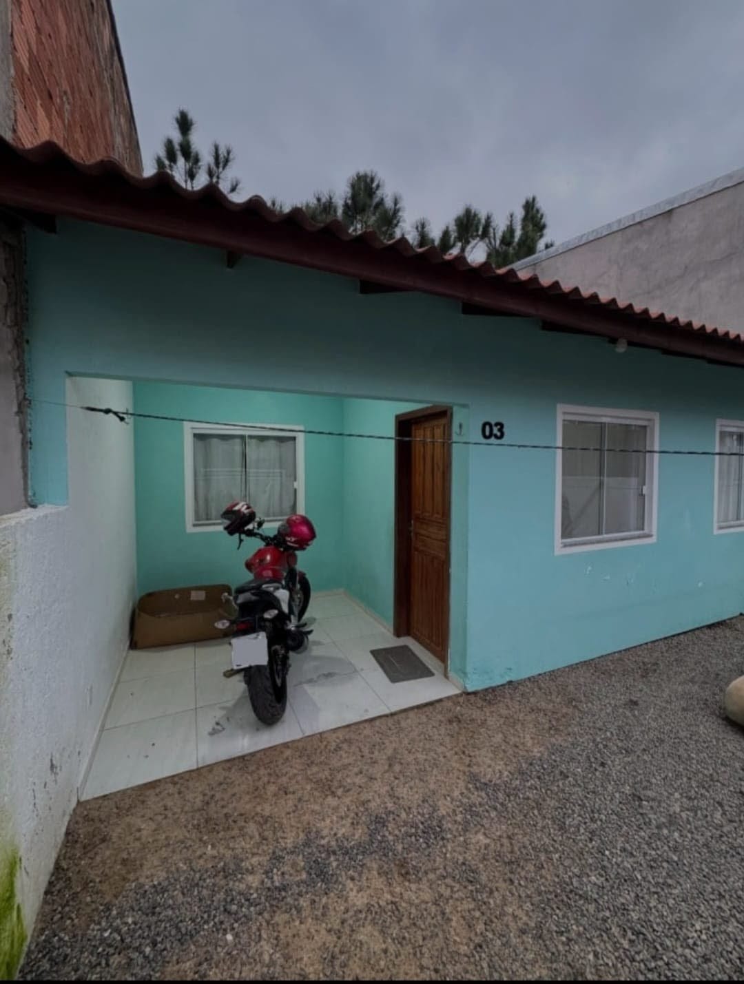 Casa de alvenaria, nova, composta de 01 dormitório, sala, cozinha, banheiro, varanda com área de serviço e garagem com churrasqueira.